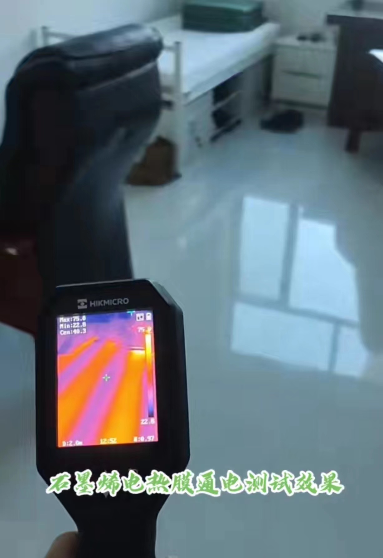 辦公室安裝的瓷磚地面,石墨烯電熱膜是鋪在水泥砂漿和瓷磚下面以后通電加熱后測(cè)試儀可以看到加熱效果